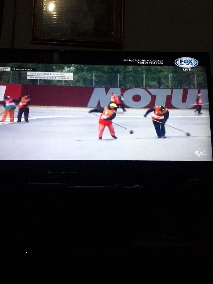 Hujan turun semakin lebat, sangat lebat bisa dibilang yah. Lalu keluarlah bendera merah yang berarti semua pembalap harus masuk ke Pit Stop dan balapan ditunda hingga hujan reda. Dengan ditundanya balapan, maka posisi pembalap saat itu digunakan sebagai patokan start ketika balapan kembali dimulai. Urutan pertama hingga ke enam adalah Dovisiozo, Petruci, Rossi, Redding, Marquez, Pedrosa.